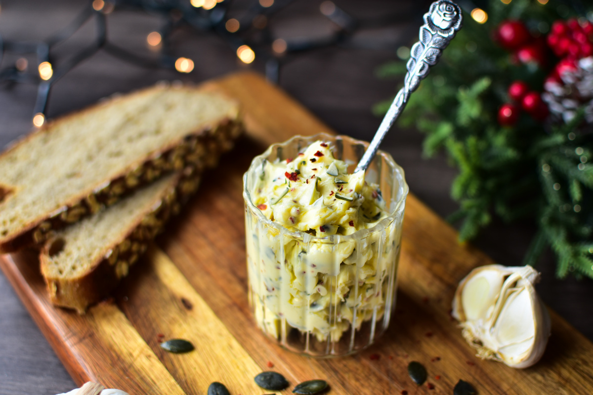 Knoblauchbutter selber machen – festliche Variante mit Kürbiskernen & Chili
